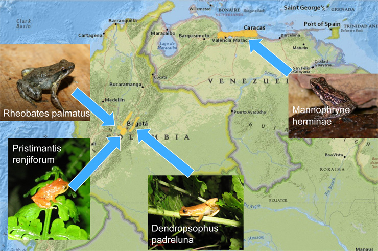 Left: a map of Venezuela and Colombia with the associated species of frogs being studied.