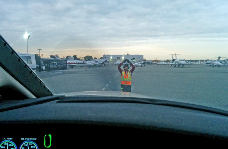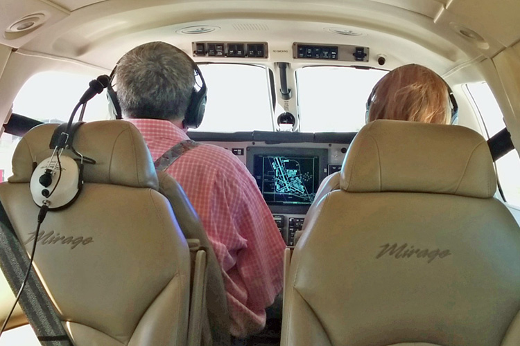 On the right, pilots Dan & Alice Lentzen request tower clearance for take off to Teterboro Airport, New Jersey.