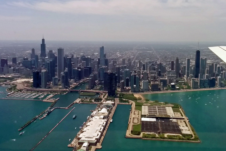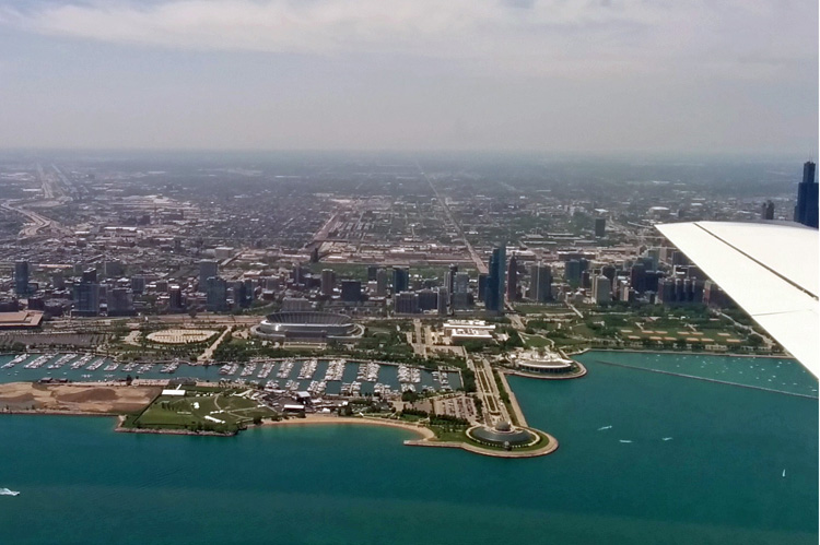 On the left you can see Chicago's Navy Pier & water filtration plant as the aircraft continues North towards Wheeling.